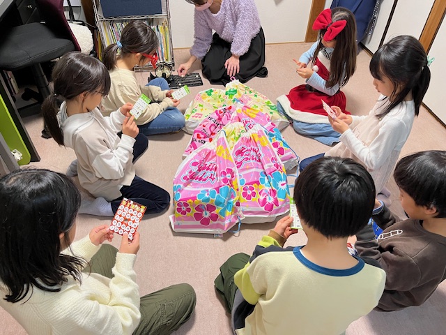 ビンゴのプレゼントを中央に置き、ビンゴスタートです!まだ数字がわからない小さな子は、先生がサポートをします。学年の大きなお兄さん、お姉さんが一緒に見てくれることもあります。